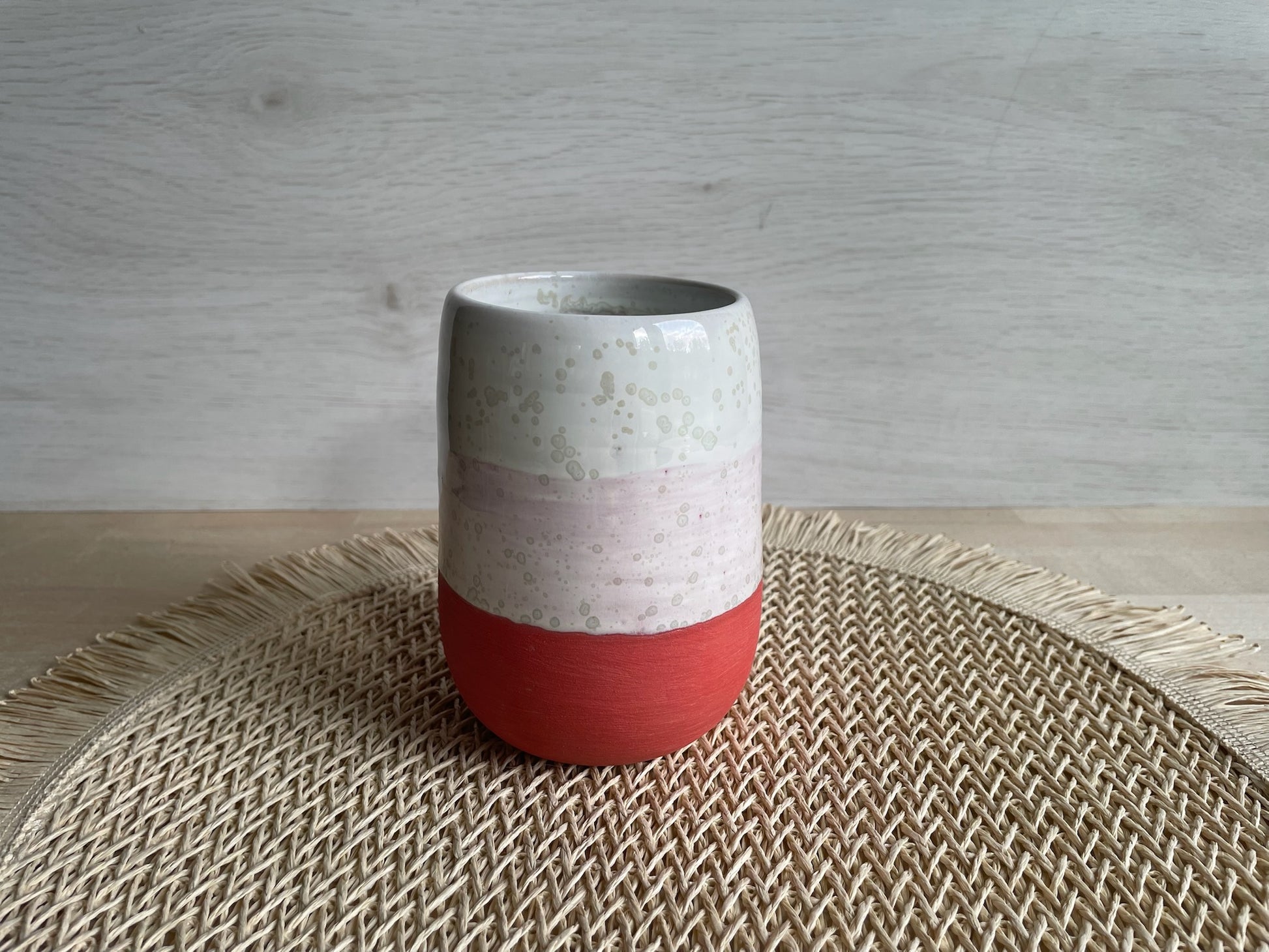 Osez l’originalité avec le gobelet Marguerite en grès émaillé blanc et rose, mêlant surfaces mates et brillantes. Plus qu’un simple rangement pour brosses à dents, il se transforme audacieusement en petit vase pour mettre en scène vos fleurs avec style. Un accessoire unique qui affirme votre personnalité dans chaque détail.