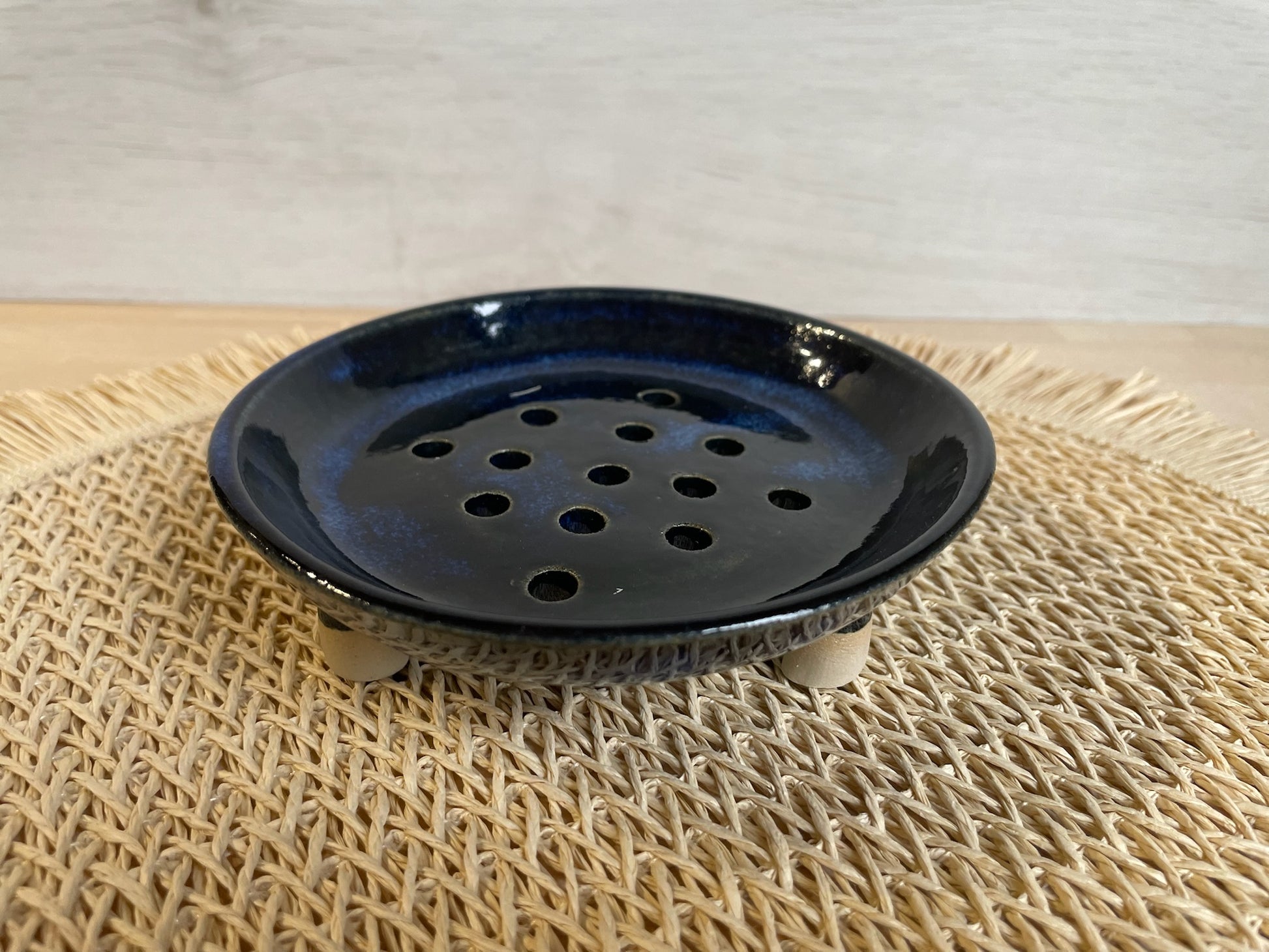 Le porte savon Nuit, en grès émaillé noir bleuté brillant, allie élégance et fonctionnalité. Ses trois petits pieds assurent une évacuation efficace de l’eau, préservant la propreté et la durabilité de votre savon. Parfaitement harmonisé avec le gobelet et le petit plateau de la même collection, il apporte une touche raffinée et cohérente à votre espace de bain.