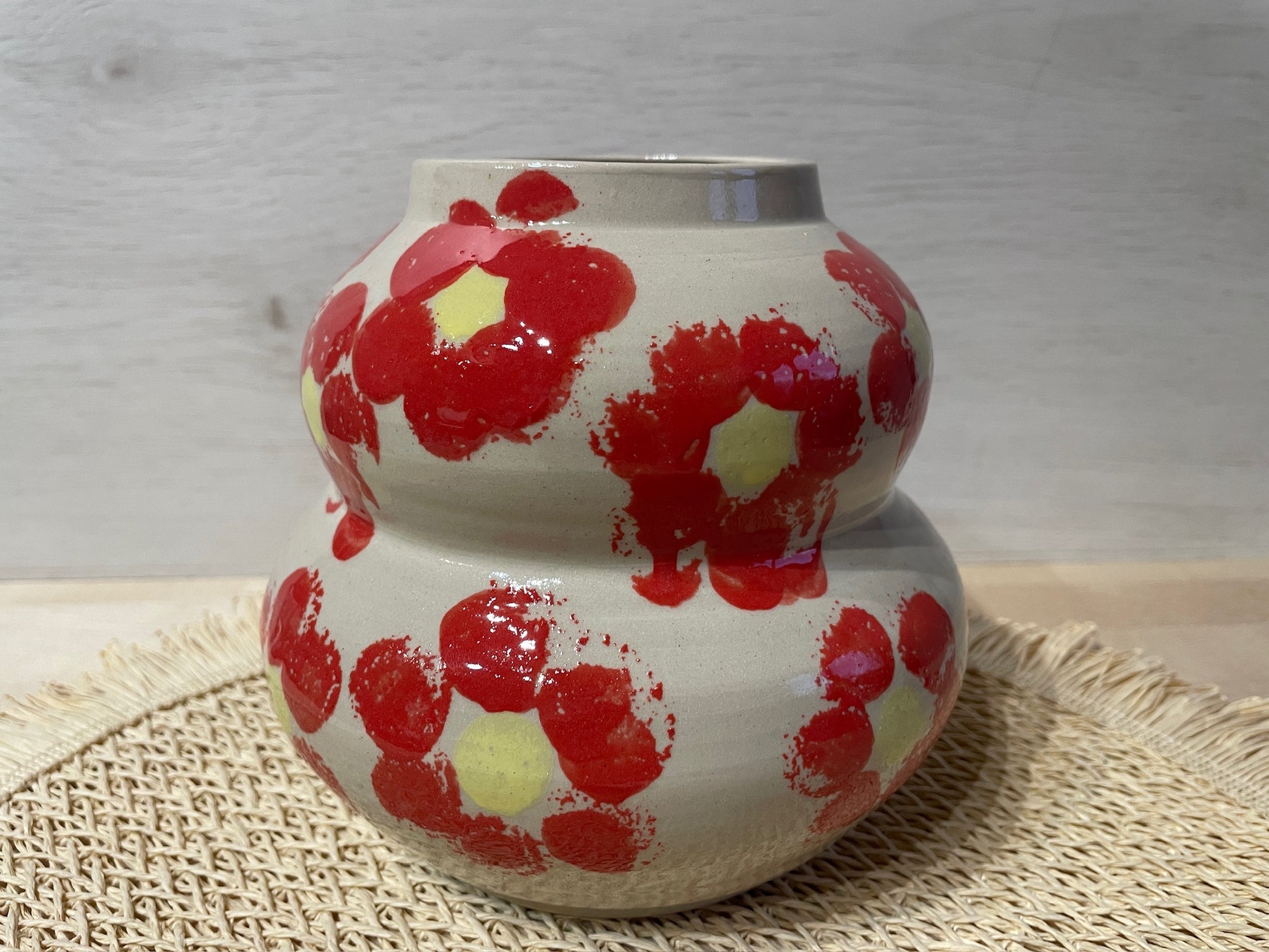 Vase en grès émaillé qui refuse la conformité. Ses formes audacieuses épousent des courbes inattendues tandis que des fleurs rouges éclatantes s'y déploient avec assurance. Créée à la main, cette pièce est unique. Un objet qui ne passe pas inaperçu, parfait pour ceux qui osent affirmer leur style.