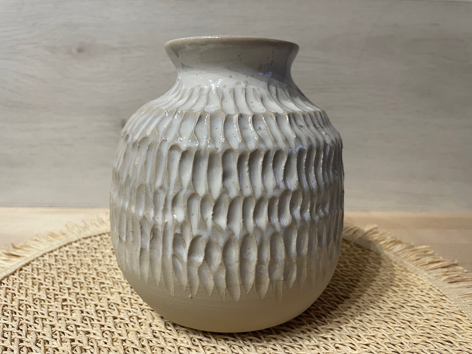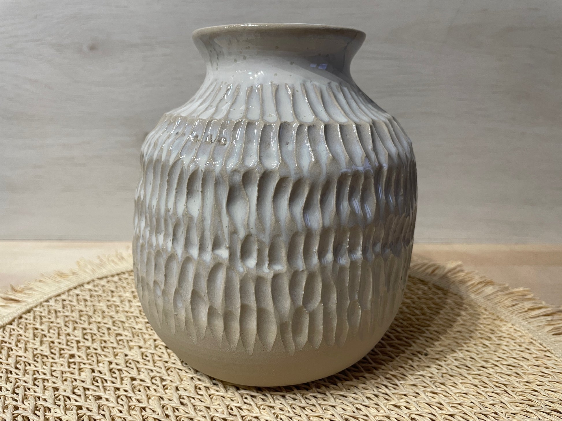 Vase tourné et sculpté en grès émaillé, une création authentique. Cette pièce unique, aux formes organiques et à l'aspect brut sera une pièce de décoration parfaite dans votre intérieur.